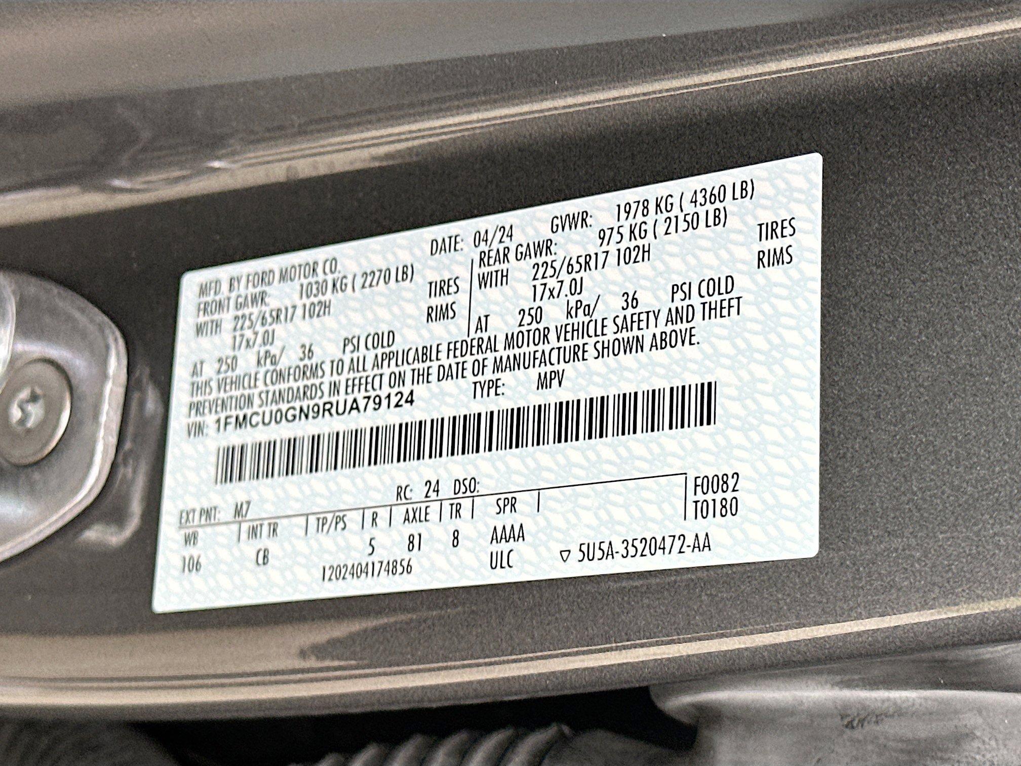 • VIN # 1FMCU0GN9RUA79124